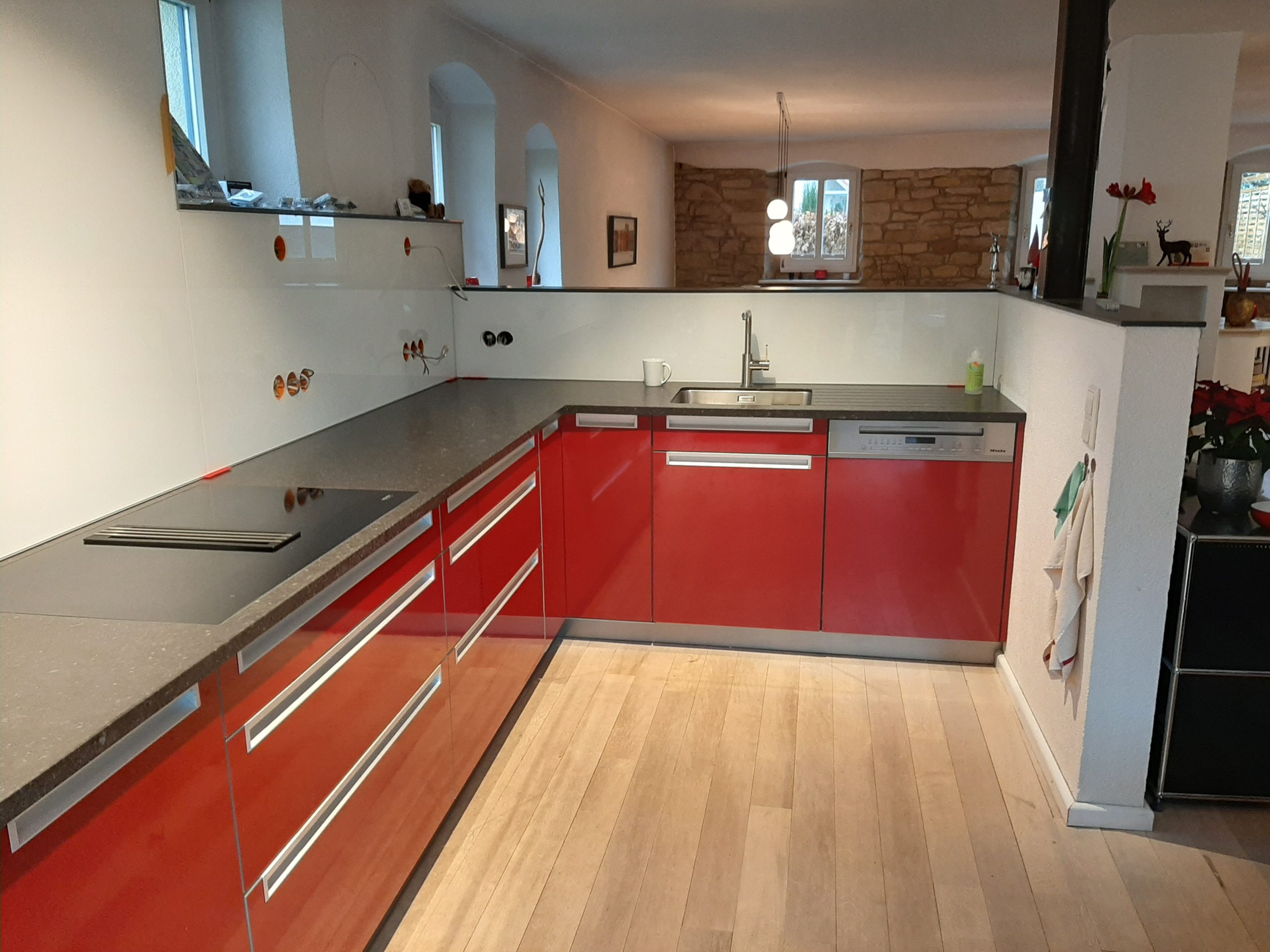 Hier haben wir eine kleinere Küchenzeile geliefert mit einer weißen matten Lackfront.Die Arbeitsplattentiefe ist 75 cm weil im hinteren Bereich des Altbaus Rohre entlanglaufen.Für die Geräte haben wir mit unserer Kundin Miele gewählt.